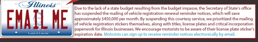 In addition, the office has set up registration forms allowing people to receive paperless renewals. People can also sign up by visiting www.cyberdriveillinois.com. They will need information from their previous registration card in order to sign up.
