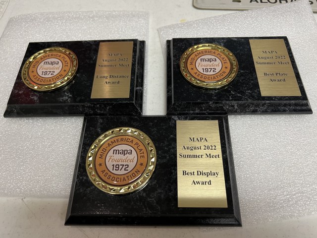 The Mid-America Plate Association held its Summer meet on August 20 in Wauconda IL. The meet was attended by 29 ALPCA members with attendees from 3 different states and plenty of donuts were available. Dale Ashe won the long distance award traveling 180 miles. Favorite plate was an Illinois 1970 Supreme Court from Brian Sawyer. Pat Settani won the best display award for his Georgia run.
